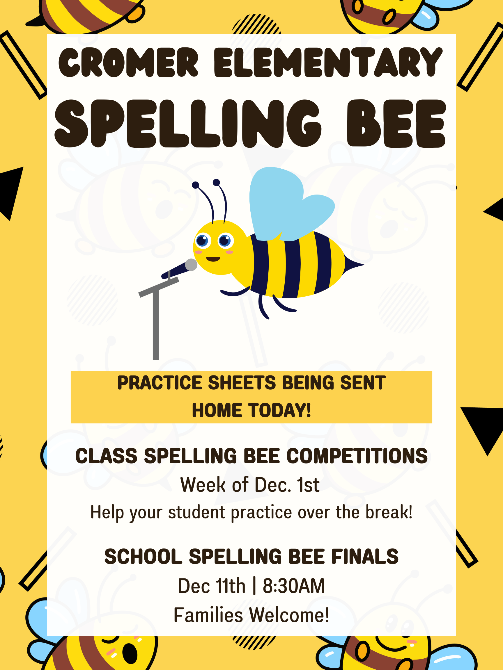 Get ready for Cromer's upcoming Spelling Bee! After Fall Break, classrooms will begin their spelling competitions and finalists will participate in the school-wide Spelling Bee Finals! Help your st...