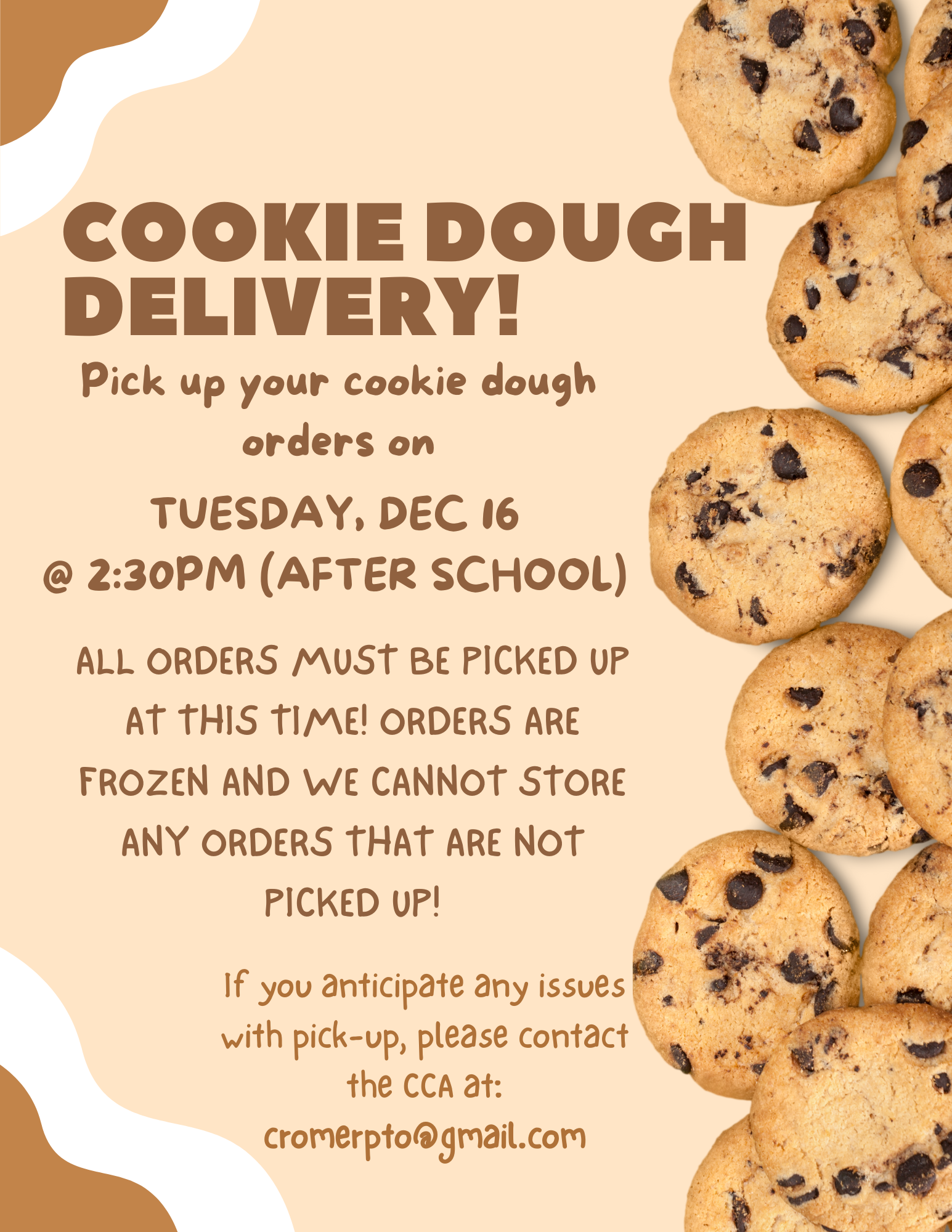 All orders from the Cookie Dough Fundraiser must be picked up Tomorrow, Tuesday December 16th from 2:20-4pm. Cookie dough MUST be picked up at this time–it is frozen and we do not have the means to...