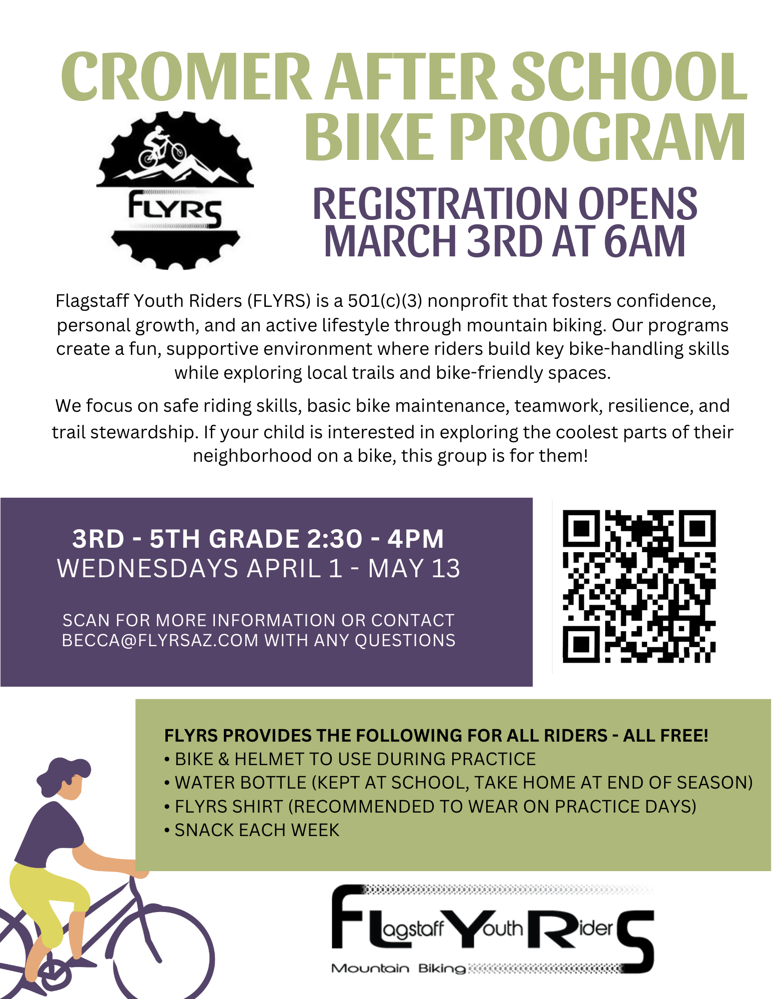 We are excited to announce that Cromer Elementary has partnered with FLYRS, a local Flagstaff nonprofit offering a FREE after-school bike program to our Cromer 3rd, 4th, and 5th graders this Spring! From April 1st to May 13th, our Cromer FLYRS team will meet Wednesdays after school with a dedicated FLYRS coach to learn riding skills, bike maintenance, teamwork, and more! If your 3rd - 5th grade student is interested in this free opportunity, registration will open March 3rd! Don't wait - space is limited! We are so excited to see our Cromer Wildcats in action with FLYRS!